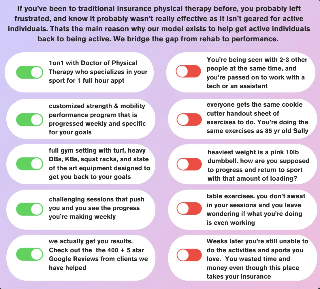 Most traditional physical therapy clinics spend 15minutes working with you and 3 other people at the same time before passing you down to assistants and aides for the actual treatment.